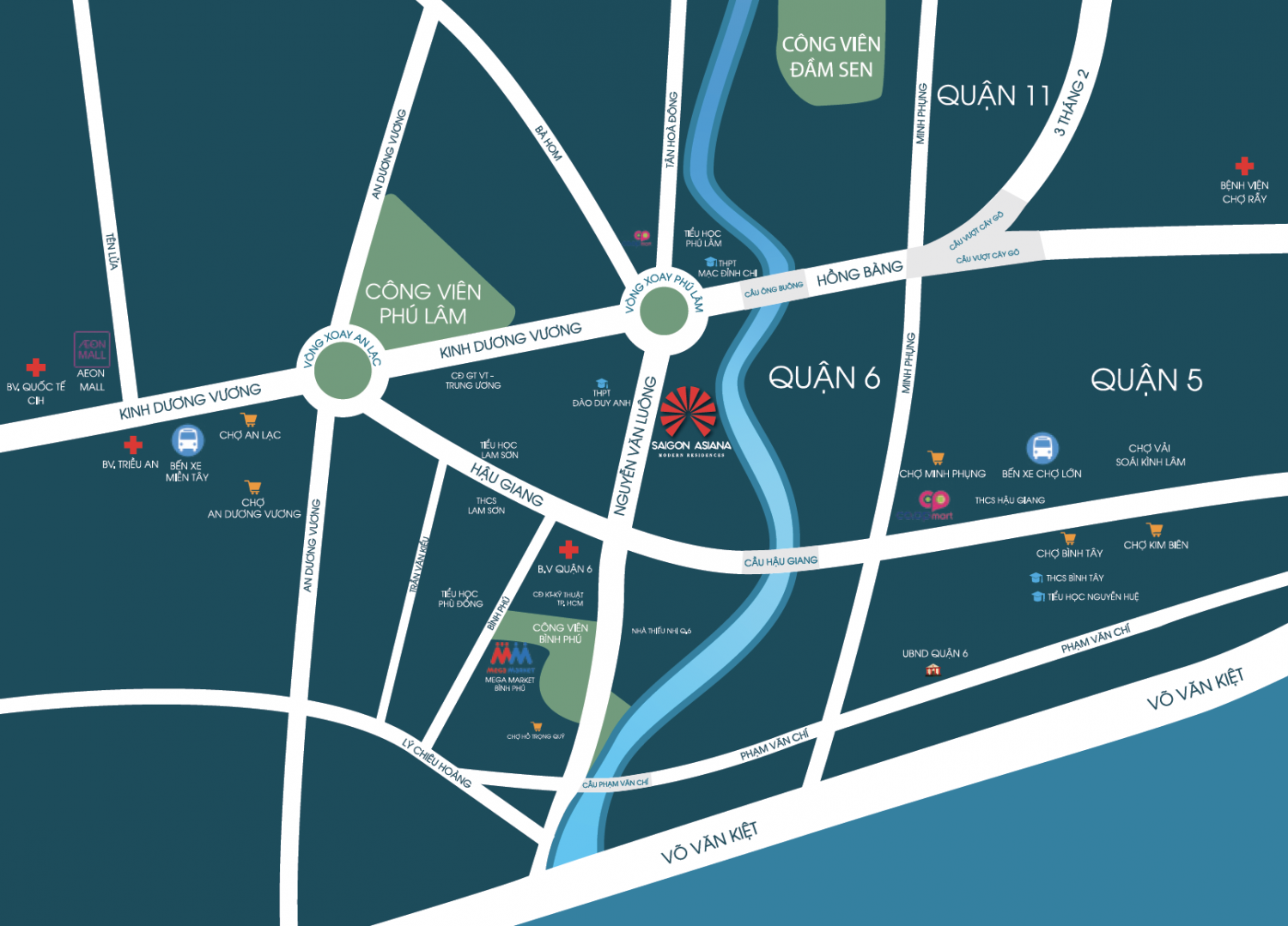 - Bệnh viện: Triều An, Chợ Rẫy, Quận 6 - Công viên: Phú Lâm, Văn Hóa Đầm Sen, Bình Phú