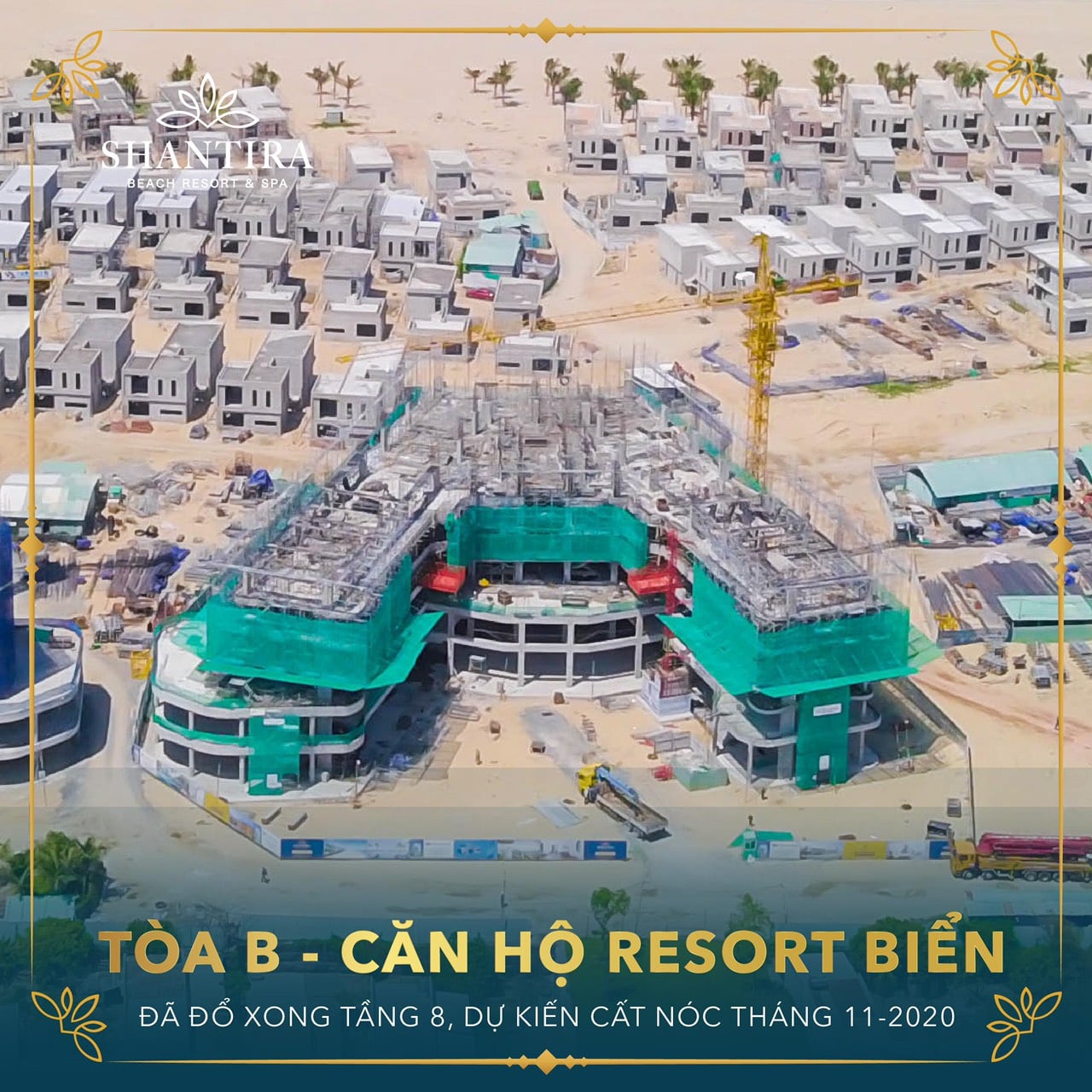 - Tính đến tháng 9/2020, các căn biệt thự biển đã cất nóc và đang trong quá trình hoàn thiện phần thô. Dự kiến sẽ cất nóc hai tòa căn hộ trong tháng 11 tới đây.